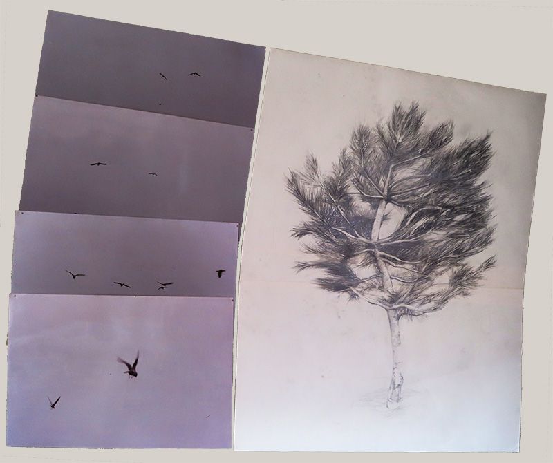 Pino. Composición – fotografías, grafito sobre papel, 147 x 182 cm