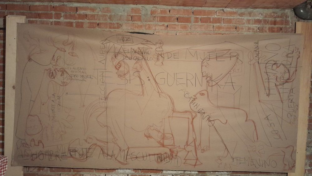 De forma automática situé una interpretación con palabras de las personas retratadas en el Guernica de Picasso. Esas serían las guías para poder dibujar luego las figuras y, a la vez, quedarían enterradas en el cuadro bajo las capas de pintura que vendrían: